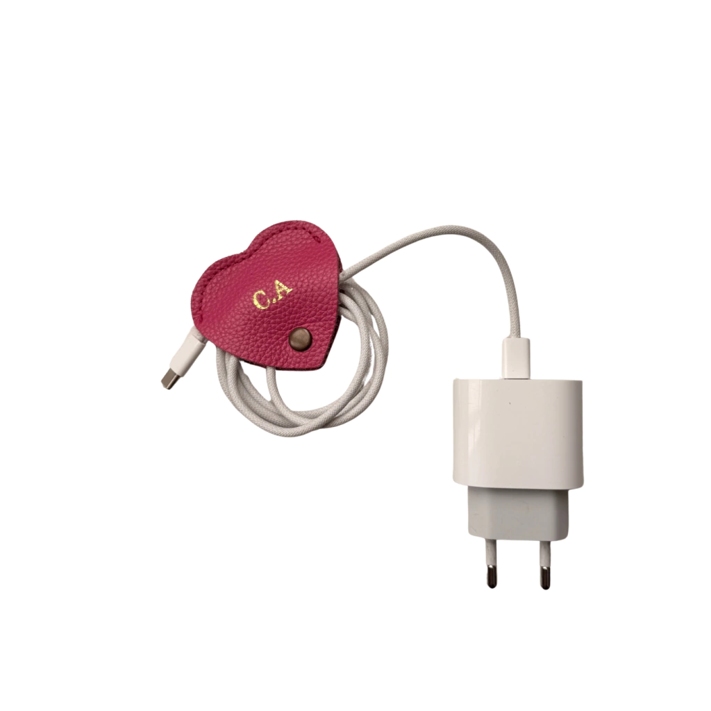O organizdor de fios Union é produzido em couro natural, possui formato de coração e fecho em botão de pressão.