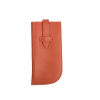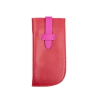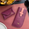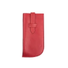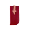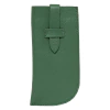 O porta óculos é produzido em couro legítimo, possui formato retangular arredondado na base e tira para fechamento.